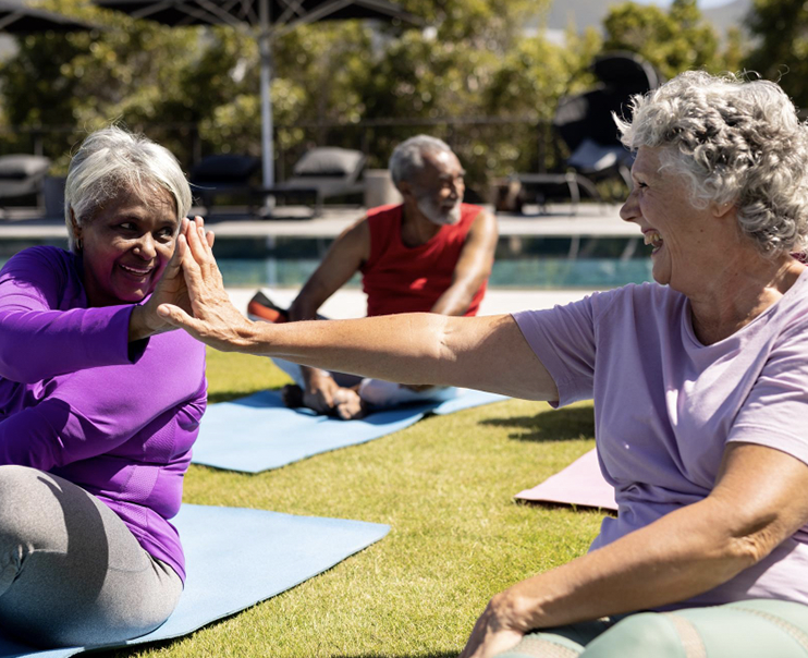 Exercise, fun and physical fitness. Community leaders often volunteer to lead yoga or other exercise sessions. Even wheelchair-bound residents find satisfaction in exercising on a regular basis.